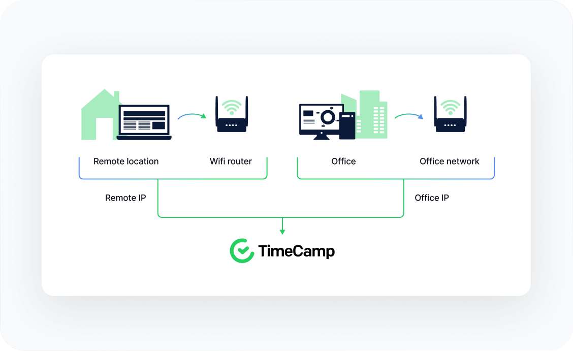 Automatically detect whether employees are working remotely or from the office. TimeCamp matches users’ IP addresses with your predefined office IPs to seamlessly track work locations—no manual effort required.