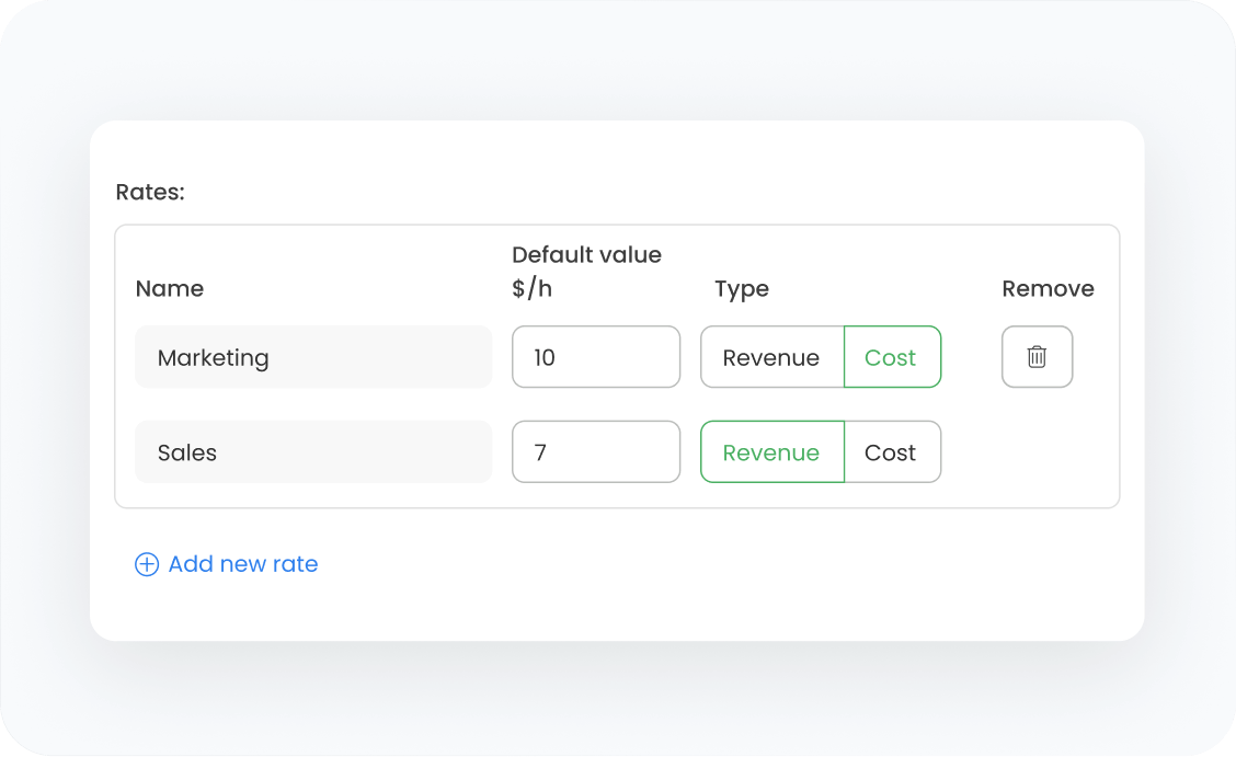 Choose default values or determine specific billing rates for different projects to streamline client billing and invoicing. Besides, you can apply historical rates (for a specific project or user) to a different timeframe.