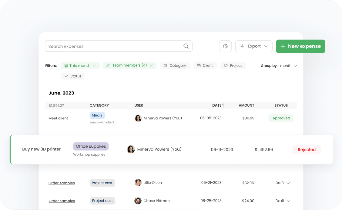 Track and manage your spending. Assign costs to the relevant projects, decide whether they’re billable, and group them into easily customizable categories.