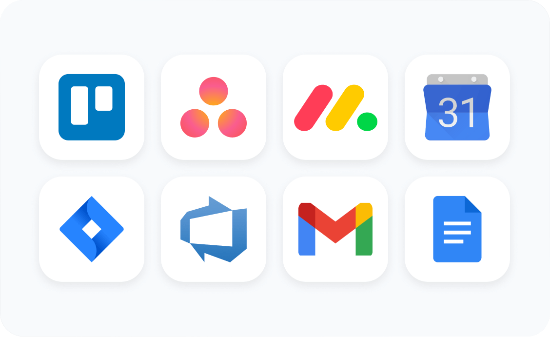 Connect TimeCamp with multiple other tools like Trello, Jira, Asana, Clickup, monday.com, Salesforce, Zendesk, or Azure DevOps to adjust our time tracker to your current workflow.