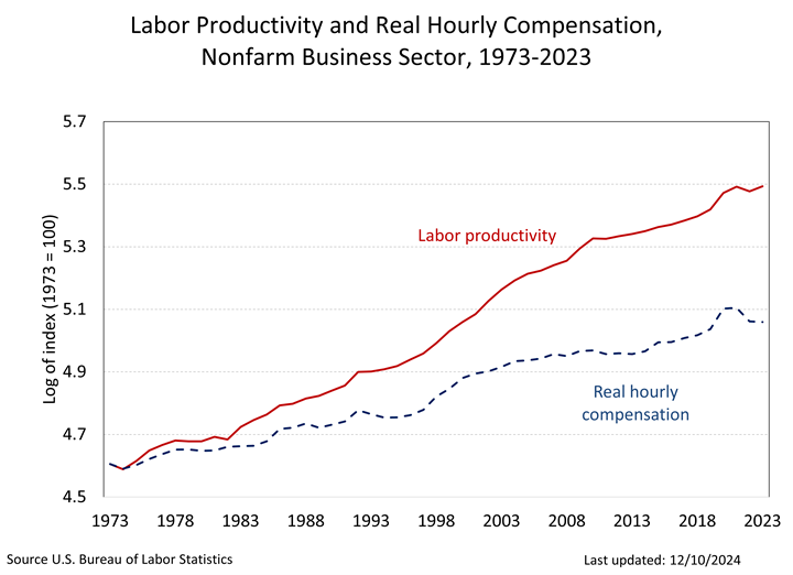 Another vital issue is compensation. According to the U.S. Bureau of Labor Statistics, there is a quite significant gap between the productivity increase and real hourly compensation: