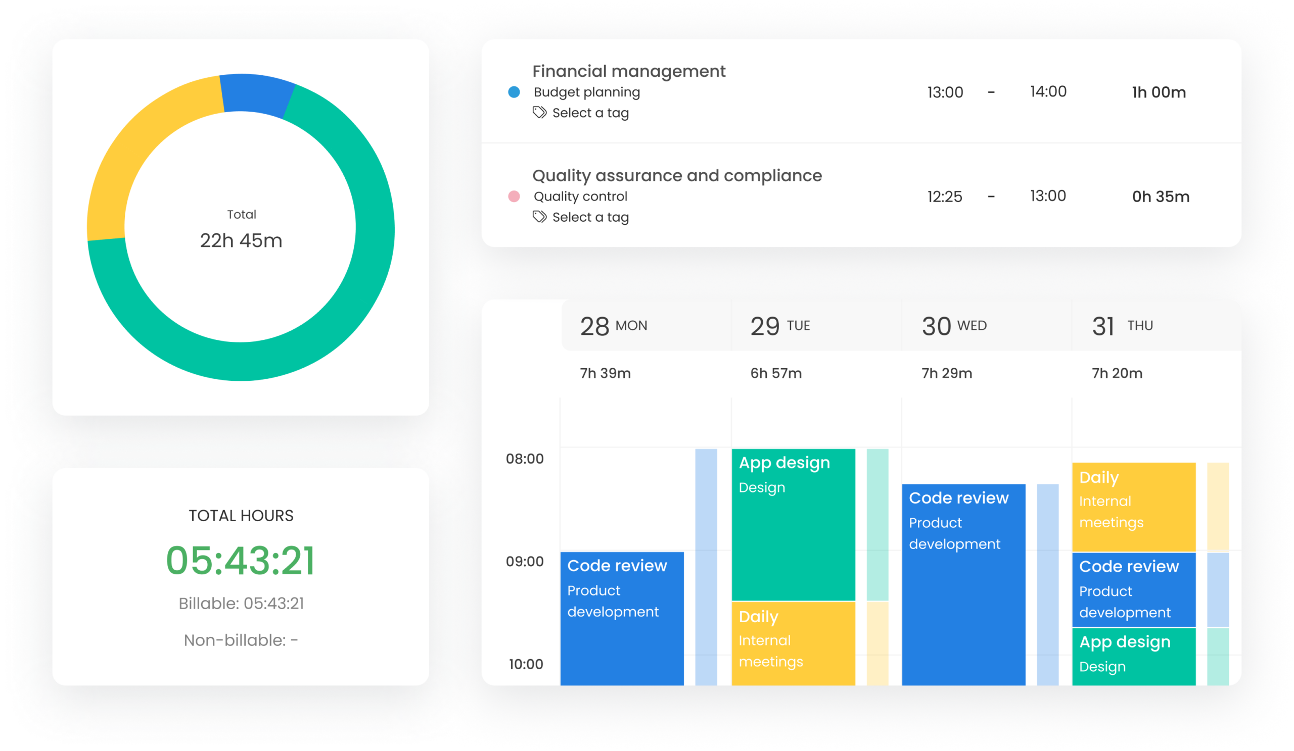 There are timesheets with approvals (useful feature for managers to check accuracy of tracked time). You can choose from daily, weekly, or graphical view. Also, integration with Google Calendar lets you track time directly for your calendar events.
