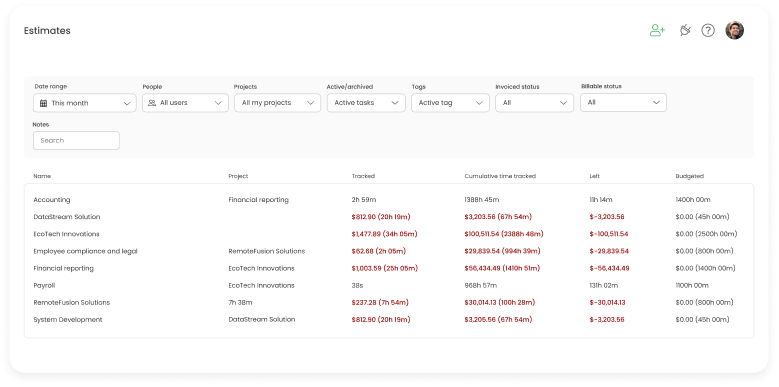 TimeCamp uses data collected by its remote desktop monitoring tool to create detailed reports about employees’ performance and project statuses. It offers a variety of customizable report templates, such as a summary of total time tracked on tasks and projects or a breakdown of more specific data like billable/non-billable hours or budget estimates.