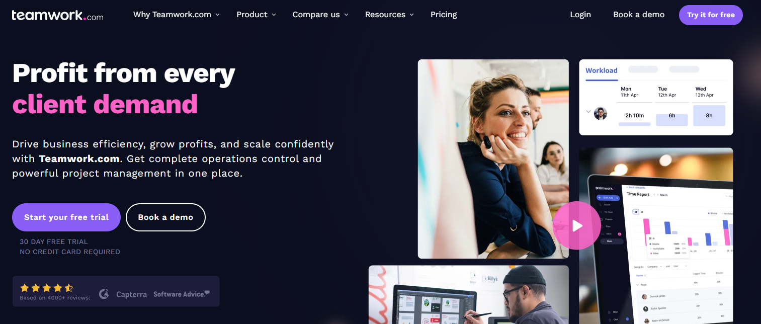 Teamwork is an all-in-one project management and team communication tool that streamlines remote team collaboration. It keeps you up to date with the team and its heavy workload and helps make wiser decisions about resourcing. Thanks to that, the remote team members’ workflow is smooth, and the risk of missing deadlines is reduced to a minimum.