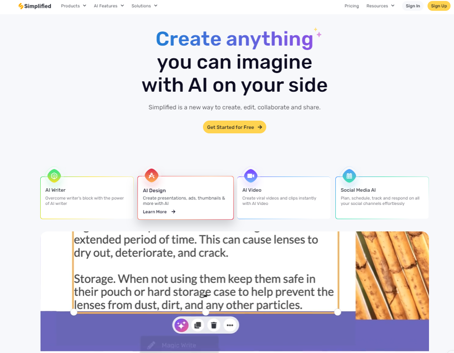 Simplify social media marketing! Simplified centralizes everything in one platform. Schedule engaging posts (made easy with their AI graphic designer!), track performance, and analyze audiences (no sweat with their AI writer!). Plus, a built-in planner keeps you organized. Go beyond basic tools with features like: