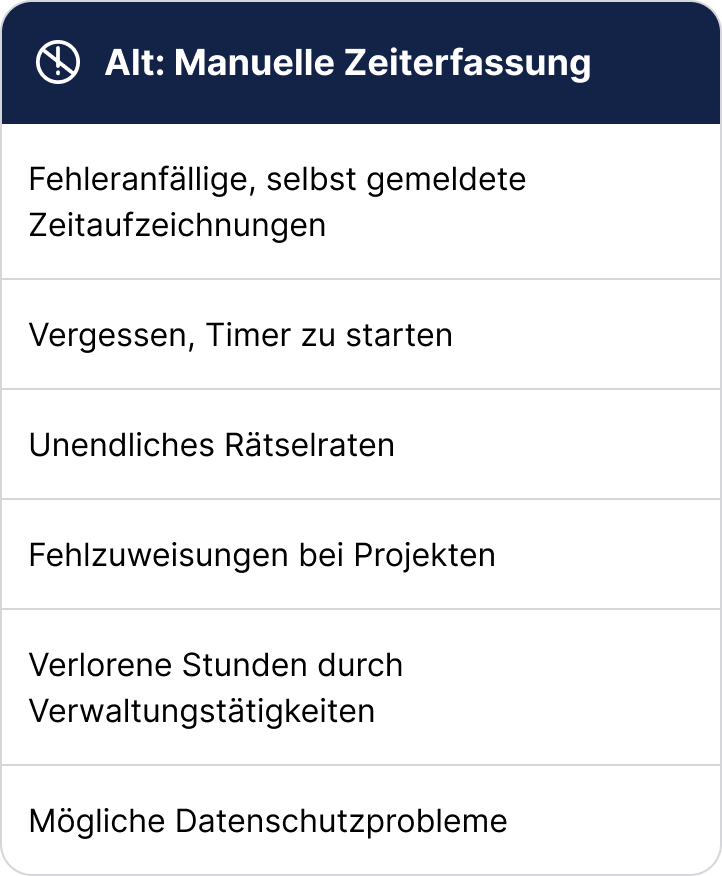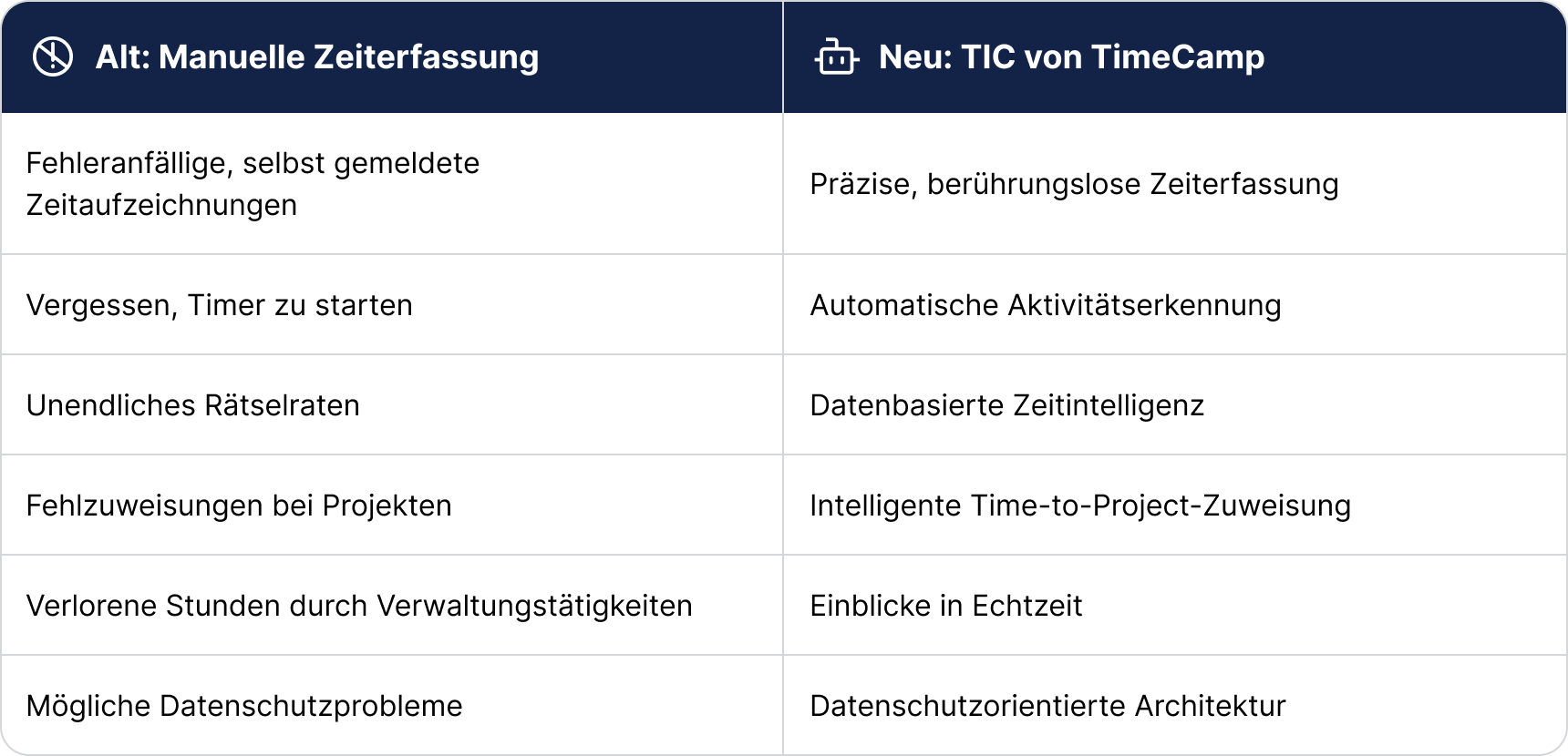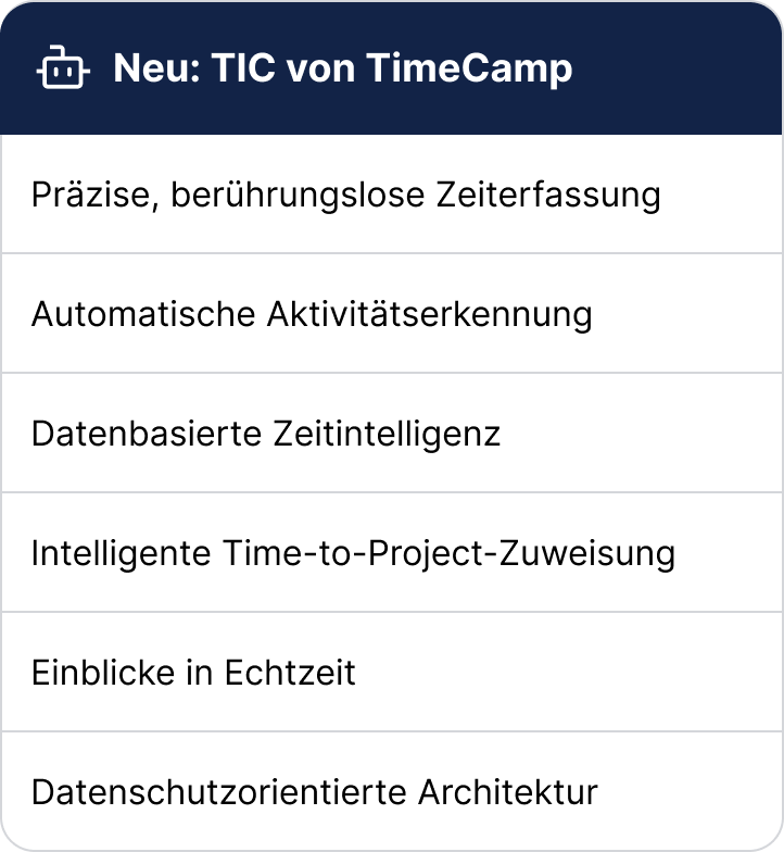 Ihr Arbeitstag ist zu kurz, um ihn mit manueller Stundeneingabe zu verschwenden. Willkommen bei TIC: Time Intelligence Center von TimeCamp, einem autonomen, proaktiven, Zero-Touch- und datenschutzorientierten Ansatz für die Zeiterfassung.