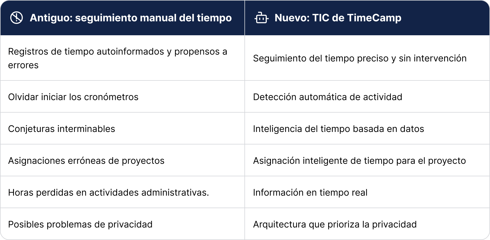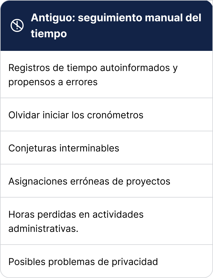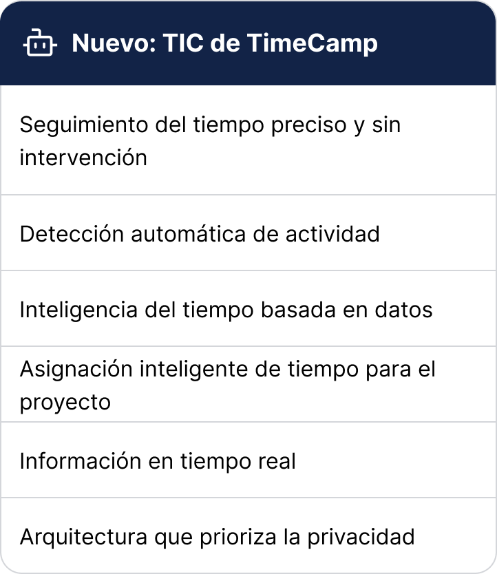 De datos sin procesar a registros listos para facturar. Las hojas de tiempo con IA de TimeCamp revolucionan el proceso al ir más allá de los registros estáticos, organizando el tiempo de manera fluida y sin dejar ingresos sin registrar.