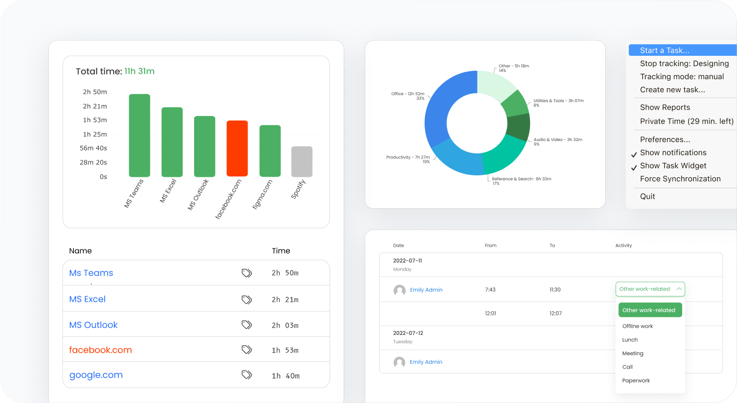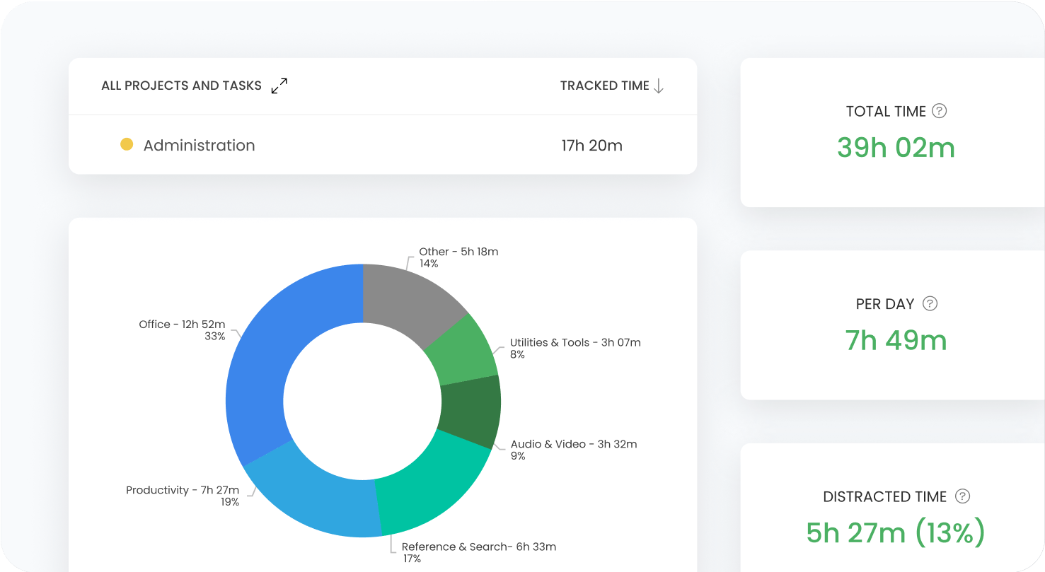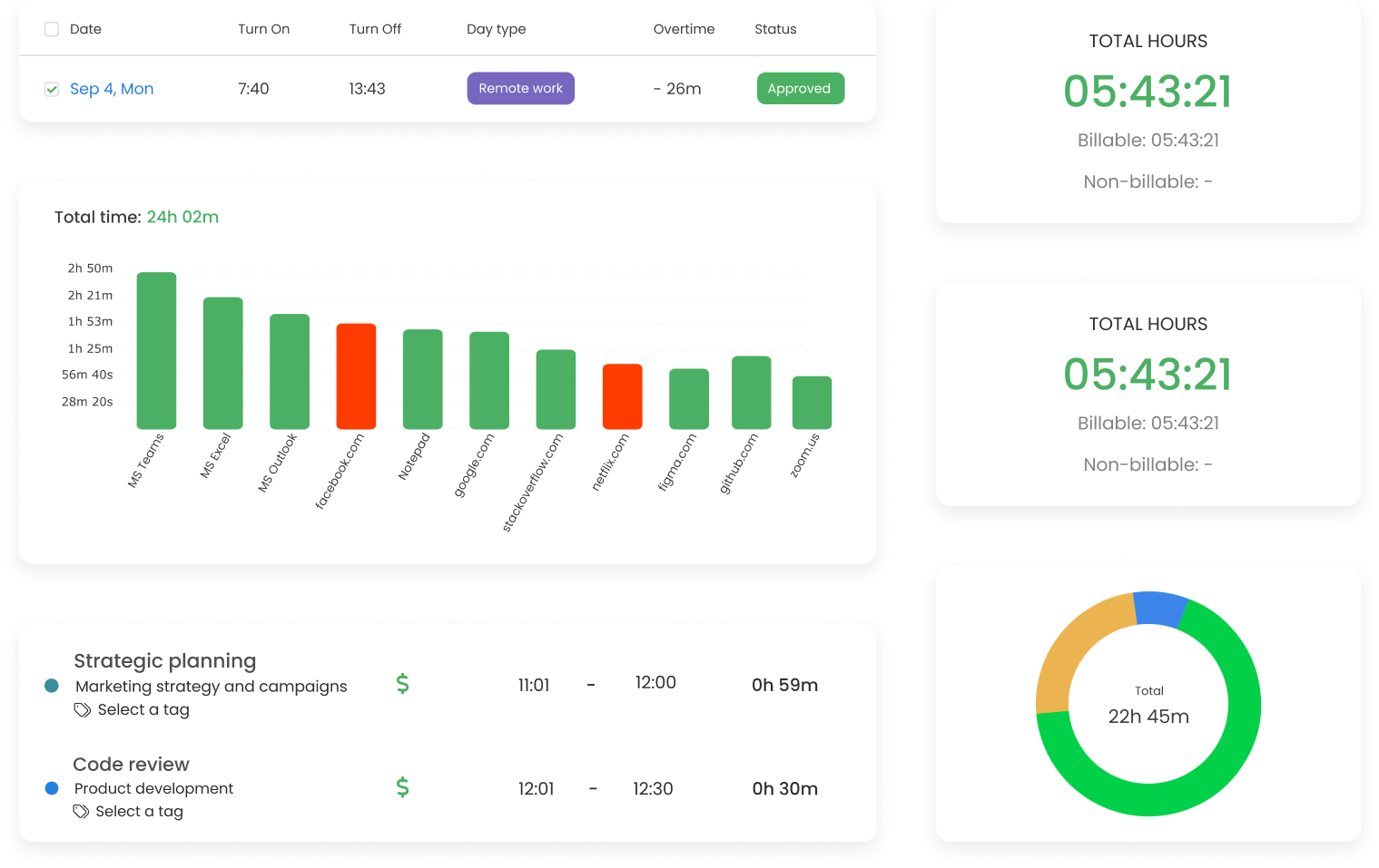Aumenta la productividad de tu equipo con el software integral de monitoreo de empleados de TimeCamp. Supervisa las horas de trabajo, los niveles de actividad y el uso de aplicaciones de manera sencilla, garantizando un uso eficiente de los recursos de la empresa, ya sea que tu equipo trabaje de forma remota, en la oficina o en un entorno híbrido.