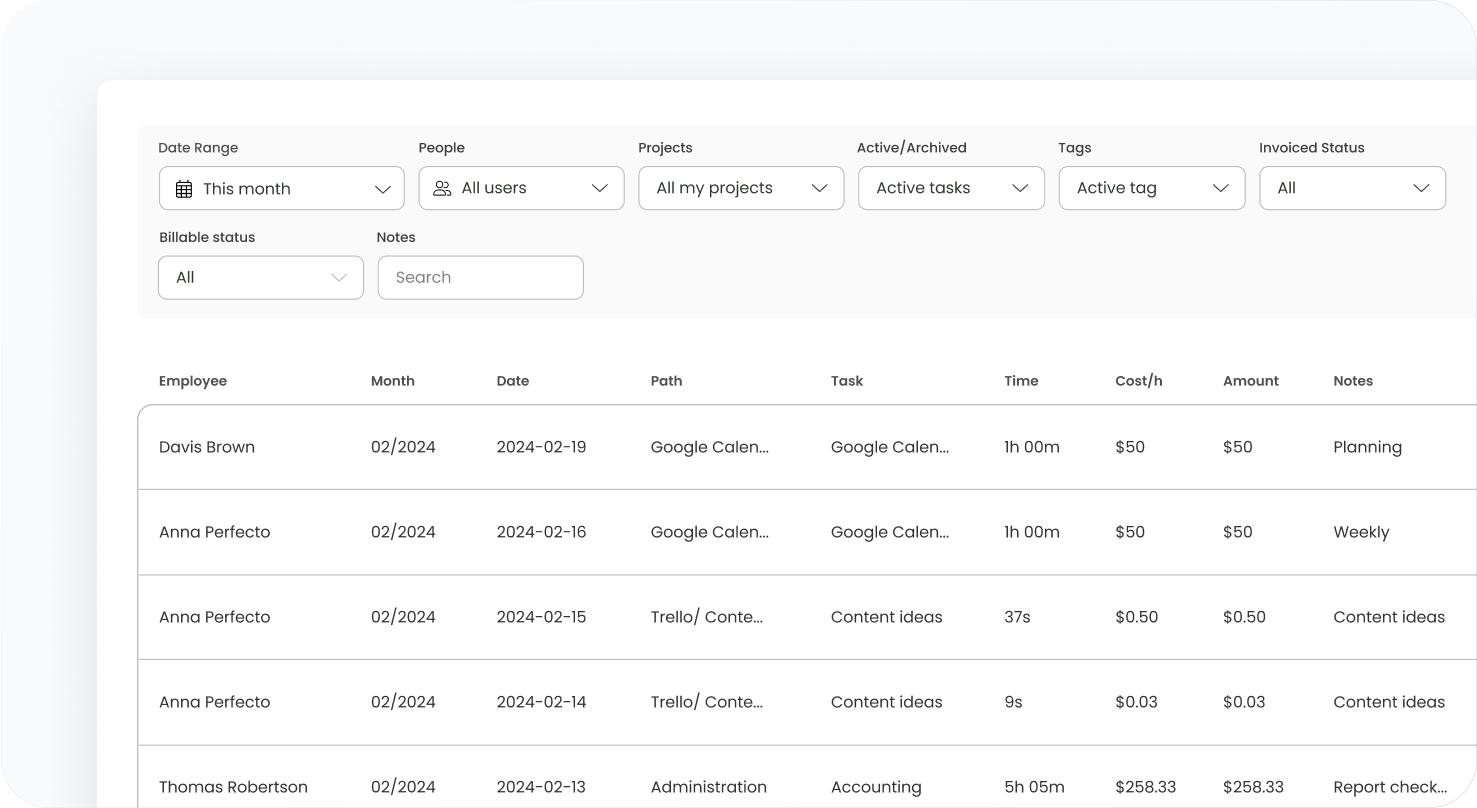 Asegura la rentabilidad y el éxito de tus proyectos con TimeCamp, un software de seguimiento de tiempo y facturación fácil de usar. Registra horas facturables y gestiona presupuestos de manera eficiente para garantizar que cada proyecto se mantenga en el camino correcto.