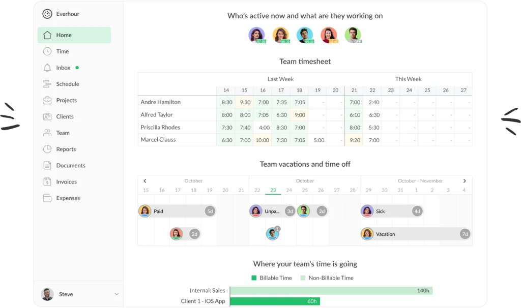 Everhour permet de créer des tâches, de suivre le temps facturable ou non facturable, de surveiller l’avancement des projets, de définir un budget fixe ou récurrent, de consulter les minuteurs de l’équipe en temps réel, et de visualiser le temps enregistré dans des rapports partagés. L’outil propose également des feuilles de temps simples avec validation, le suivi des congés et absences pour éviter les conflits de planning, ainsi que le stockage des informations importantes, des notes ou des détails de projet dans des documents.