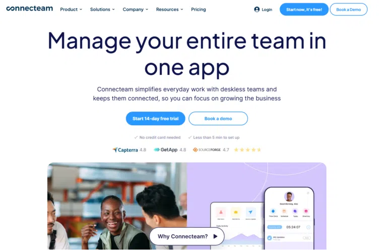 Connecteam to najlepsze darmowe oprogramowanie do ewidencji czasu pracy dla zdalnych zespołów do 10 osób. Pozwala nie tylko śledzić czas i tworzyć karty, ale również utrzymywać kontakt z zespołem niezależnie od lokalizacji.