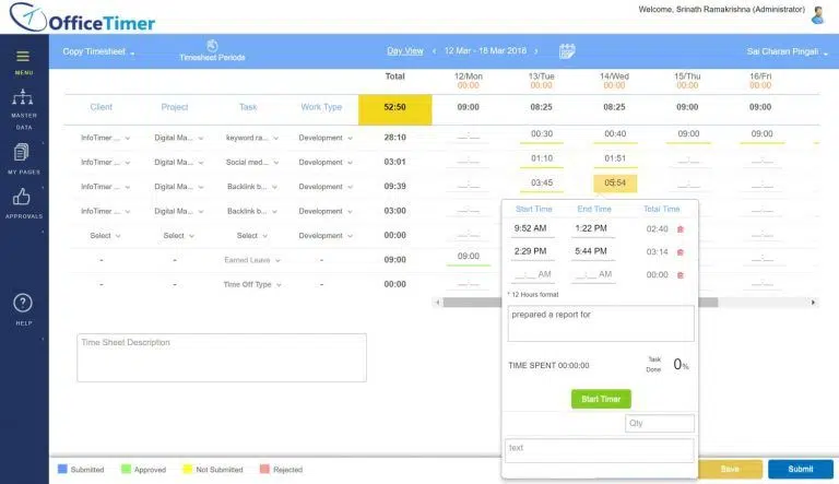 Używanie TimeCamp jako aplikacji do kart czasu pracy jest znacznie łatwiejsze niż ręczne wpisywanie danych. Oferuje możliwość zatwierdzania wpisów, edycji, zegara czasu pracy oraz szczegółowe dane.