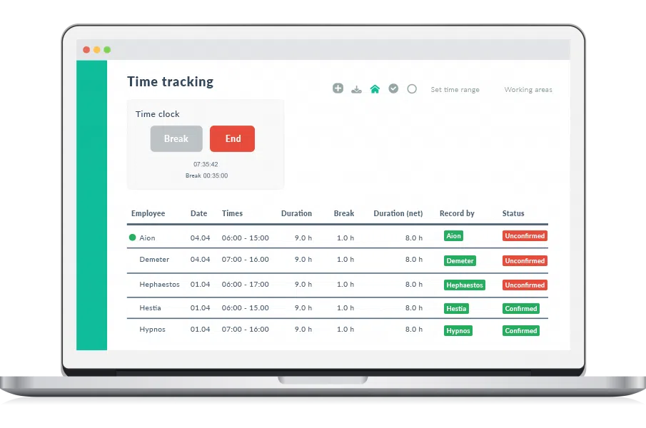 Pracownicy mogą rejestrować czas pracy przez aplikacje mobilne lub desktopowe. Weryfikacja może odbywać się przez podpis lub kod PIN, a także istnieje możliwość sprawdzenia, czy logowanie nastąpiło z autoryzowanego adresu IP. Pracownicy mogą zostawić nazwy zadań i notatki, jeśli podczas zmiany wydarzyło się coś ważnego. Czas pracy można również rejestrować zgodnie z grafikiem zmianowym.
