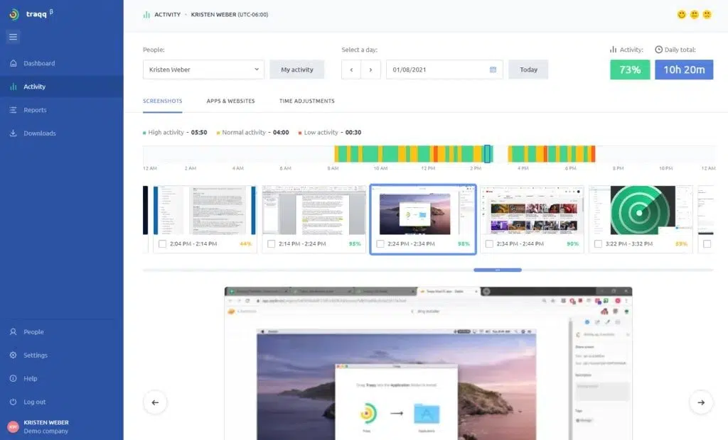 Narzędzie oferuje cztery tryby robienia zrzutów ekranu, w tym także opcję z pulpitem widocznym dla menedżera. WebWork pozwala także kategoryzować aktywność jako produktywną, neutralną lub nieproduktywną. Wszystko to przy zachowaniu prostego interfejsu użytkownika i wielu możliwości eksportu danych.