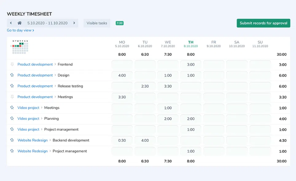 zrzut ekranu przedstawiający timesheet w aplikacji myhours