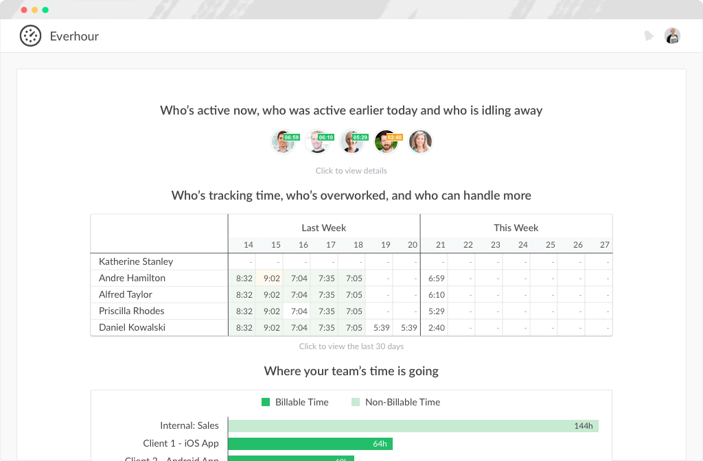 Everhour oferuje darmowy plan dla maksymalnie 5 użytkowników. To automatyczne narzędzie do śledzenia czasu, które działa także jako menedżer zadań.