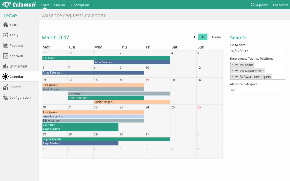 Calamari szczególnie wspiera działy HR w zarządzaniu urlopami, zwolnieniami chorobowymi i szkoleniami.