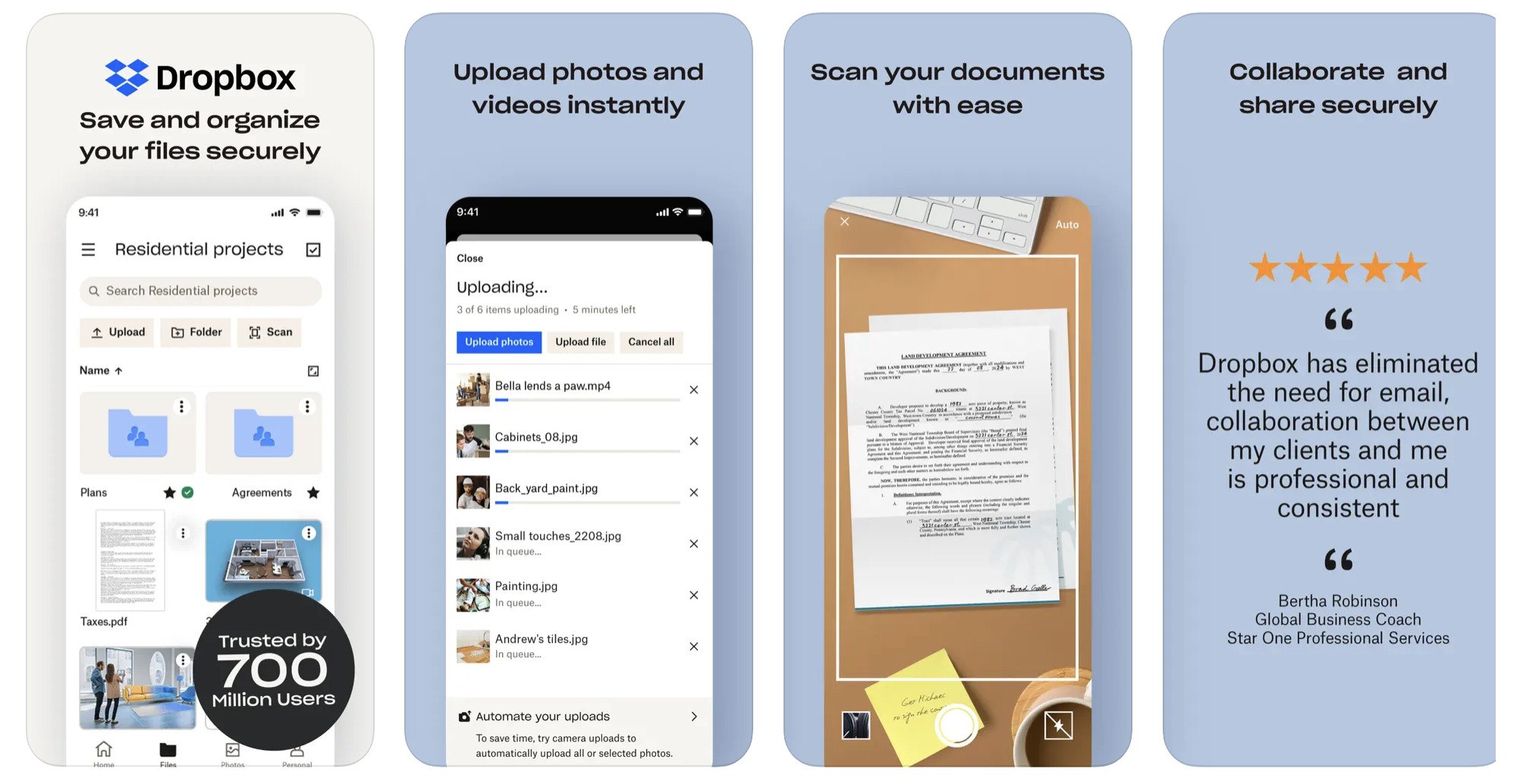 Dropbox ma intuicyjny interfejs do przesyłania i udostępniania plików, więc możesz to zrobić bez wysiłku. Funkcje dostępu offline i skanowania dokumentów są bardzo przydatne dla użytkowników mobilnych. Zapewnia także bezpieczne przechowywanie danych w chmurze z wieloma kopii zapasowymi i szyfrowaniem.