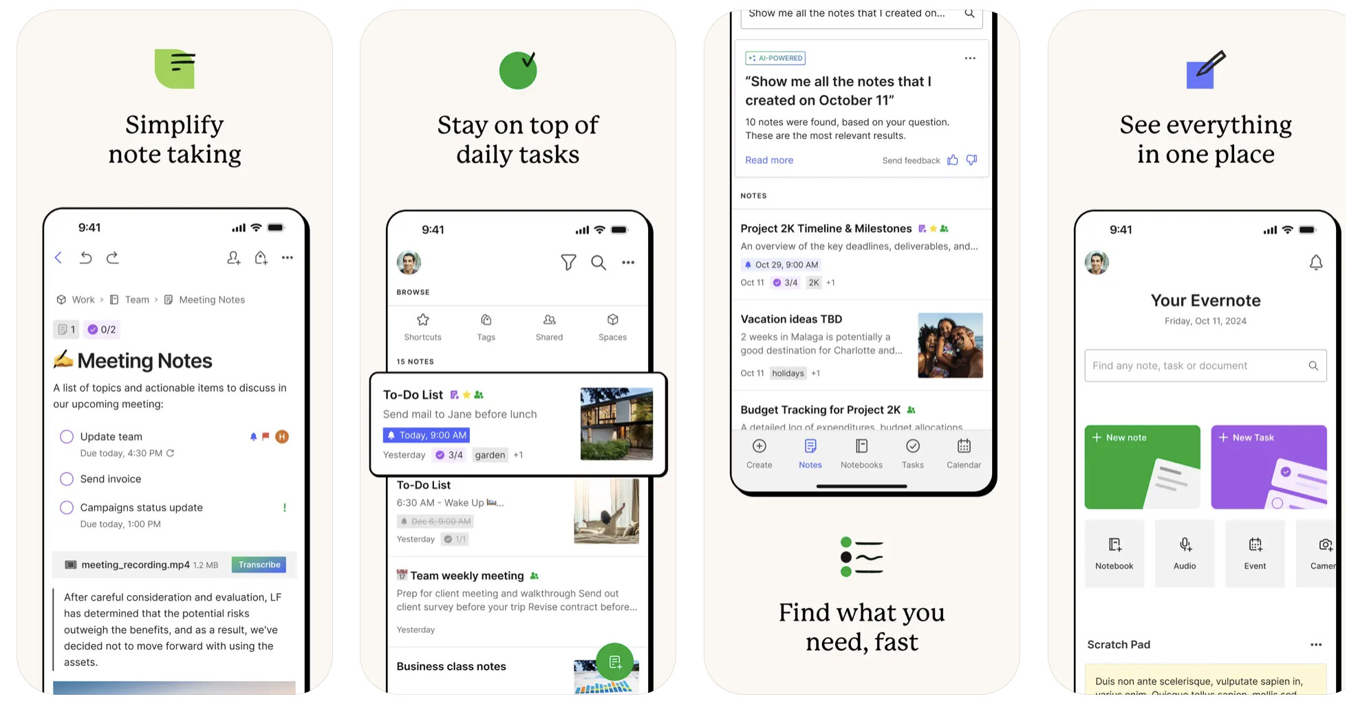 Notatki można łatwo przeszukiwać za pomocą intuicyjnej wyszukiwarki i funkcji AI-Powered Search, która umożliwia filtrowanie treści przy użyciu języka naturalnego. Poza klasycznym pisaniem, Evernote umożliwia nagrywanie notatek głosowych, co pozwala szybko zapisać myśl bez konieczności jej przepisywania.