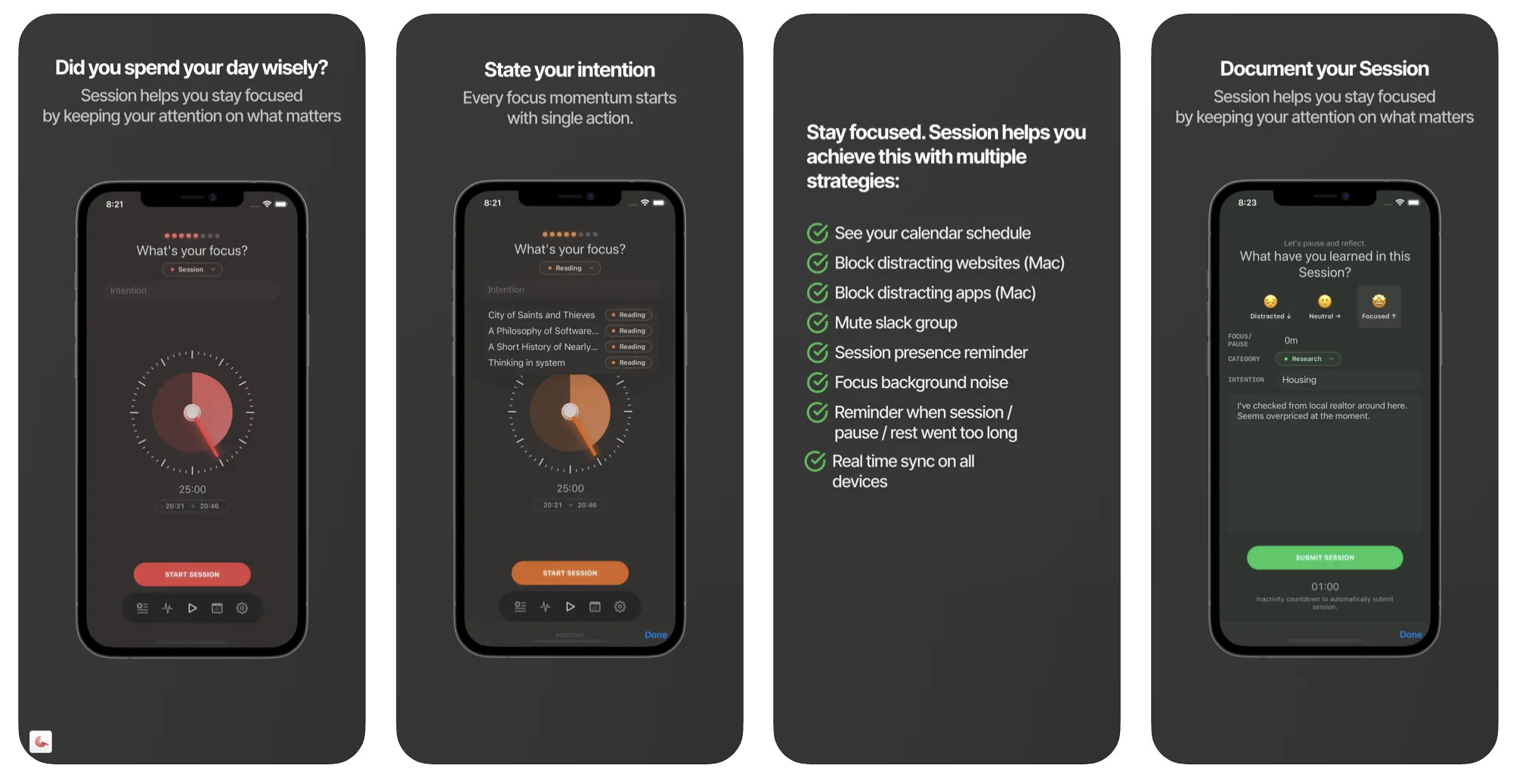 Session to timer techniki Pomodoro, który synchronizuje się z kalendarzem, aby wspierać tryb skupienia i monitorować produktywność. Technika Pomodoro polega na naprzemiennym wykonywaniu zadań w blokach czasowych i krótkich przerwach. Session działa również jako aplikacja blokująca rozpraszacze (wyłącznie w wersji desktopowej), pomagając utrzymać koncentrację.