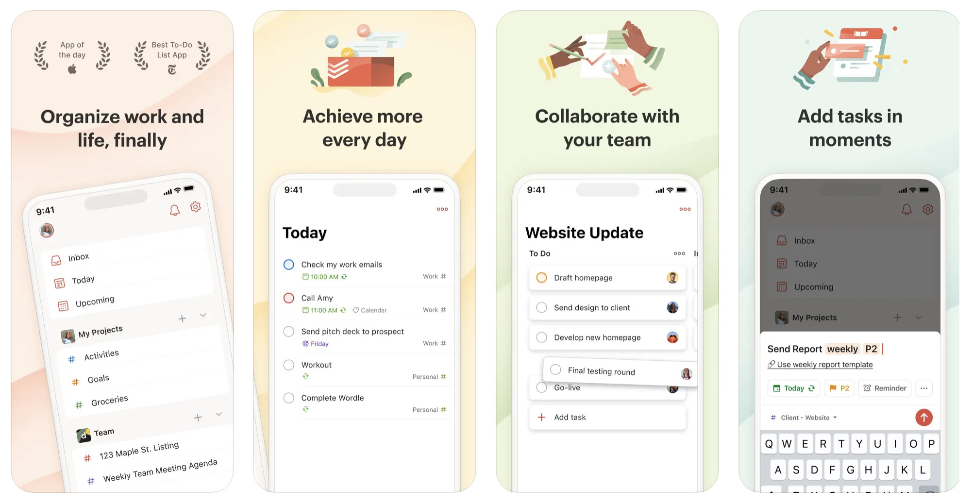 Aplikacja na iPhone’a umożliwia szybkie tworzenie nowych zadań z wykorzystaniem języka naturalnego (bardzo intuicyjny sposób dodawania zadań), przypisywanie priorytetów wg dnia (Dzisiaj, Nadchodzące itd.) i przeglądanie tygodnia w widoku kalendarzowym. Możesz również stworzyć przestrzeń do współpracy zespołowej w ramach jednej platformy.