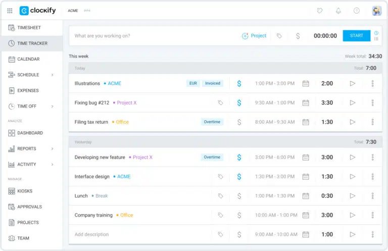 Z kolei aplikacje do ewidencji czasu pracy mają zwykle szerszy zakres niż zwykłe aplikacje do śledzenia czasu. Umożliwiają śledzenie czasu wielu członków zespołu, oferują funkcje zarządzania projektami i raportowania — idealne dla małych i dużych firm.