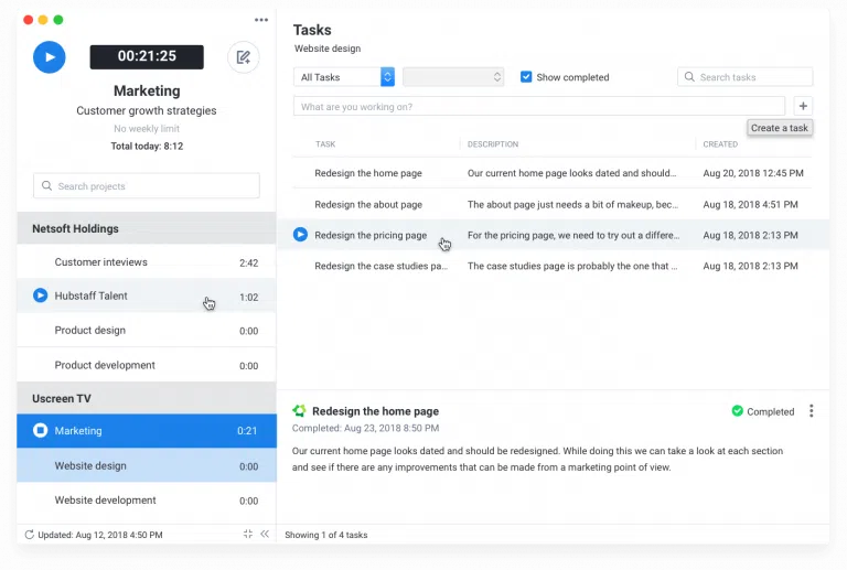 Aplikacja desktopowa TimeCamp to jedno z najbardziej wygodnych rozwiązań na rynku. Możesz przypisywać zadania jednym kliknięciem i zmieniać je w zależności od potrzeb – ręcznie lub automatycznie.