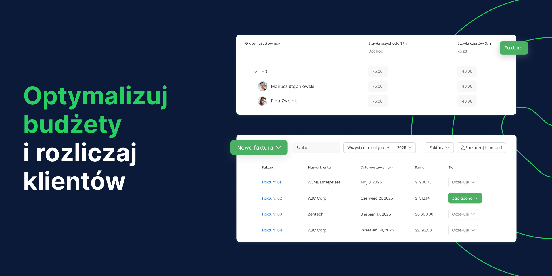 Śledź czas w projektach i zadaniach, twórz raporty i rozliczaj klientów — wszystko w jednym narzędziu.
