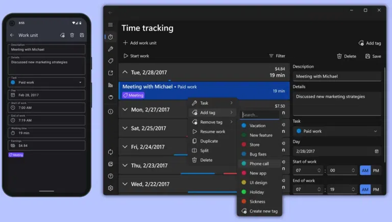 Dzięki specjalnym tagom można dostosować czas pracy i wynagrodzenie, filtrować wpisy według tagów i zadań oraz analizować dane przy użyciu wykresów.
