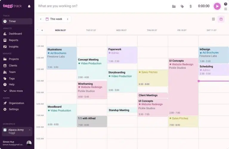 Toggl Track to aplikacja do mierzenia czasu na PC idealna dla początkujących użytkowników, którzy szukają prostego i darmowego timera. Pokazuje, ile czasu spędzasz na konkretnych zadaniach.