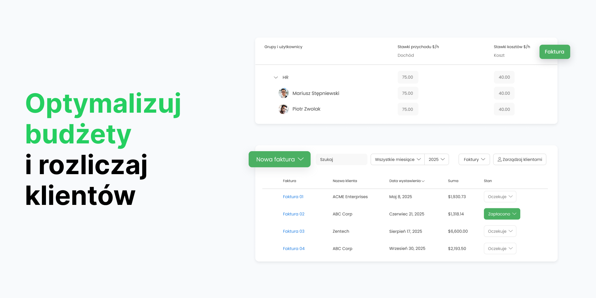 • Łatwe fakturowanie na podstawie przepracowanych godzin