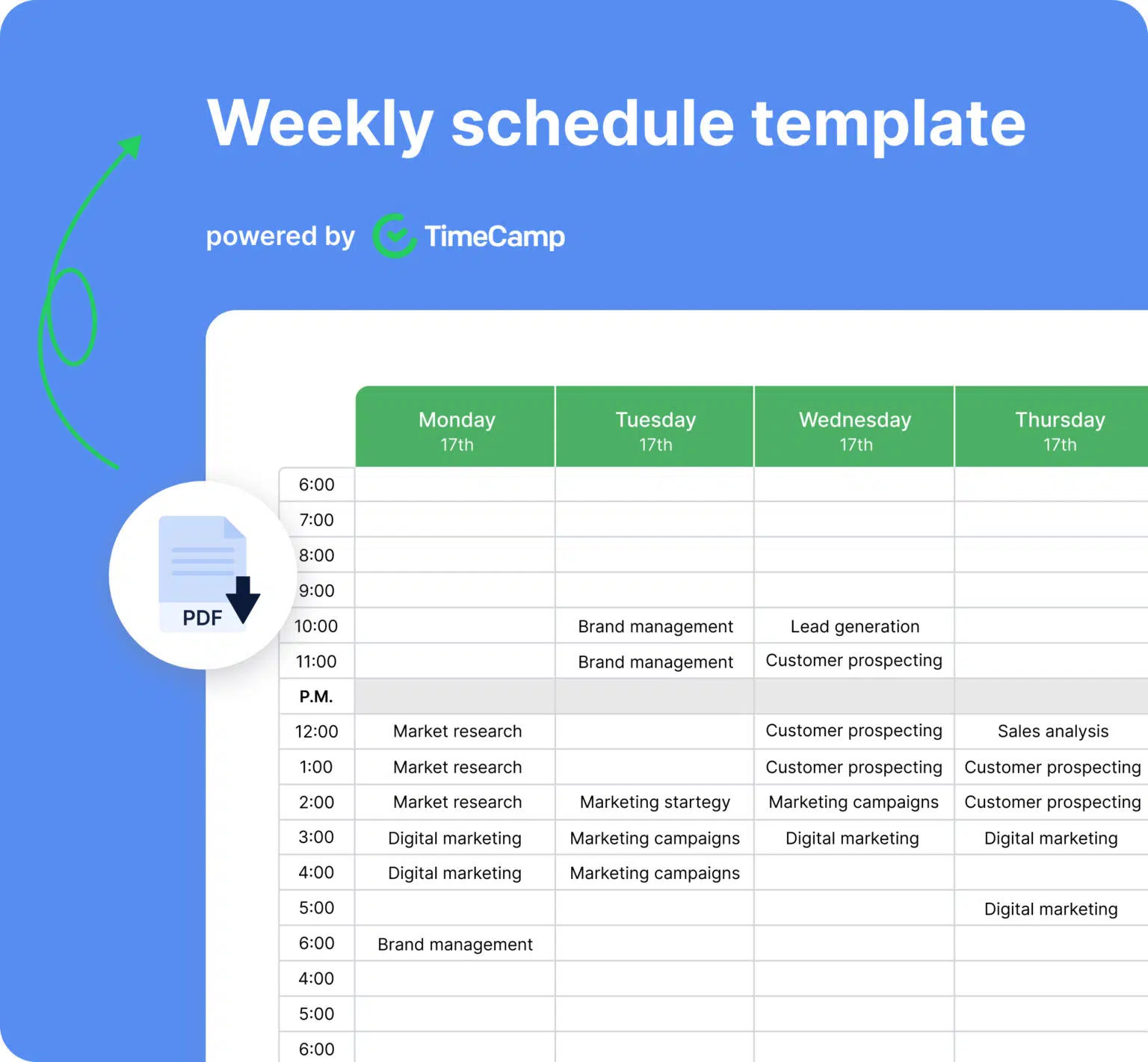 grafika przedstawiająca darmowy szablon harmonogramu tygodniowego TimeCamp na potrzeby artykułu pt. Najlepsze darmowe szablony harmonogramów tygodniowych, które pomogą Ci zorganizować czas w 2025 roku