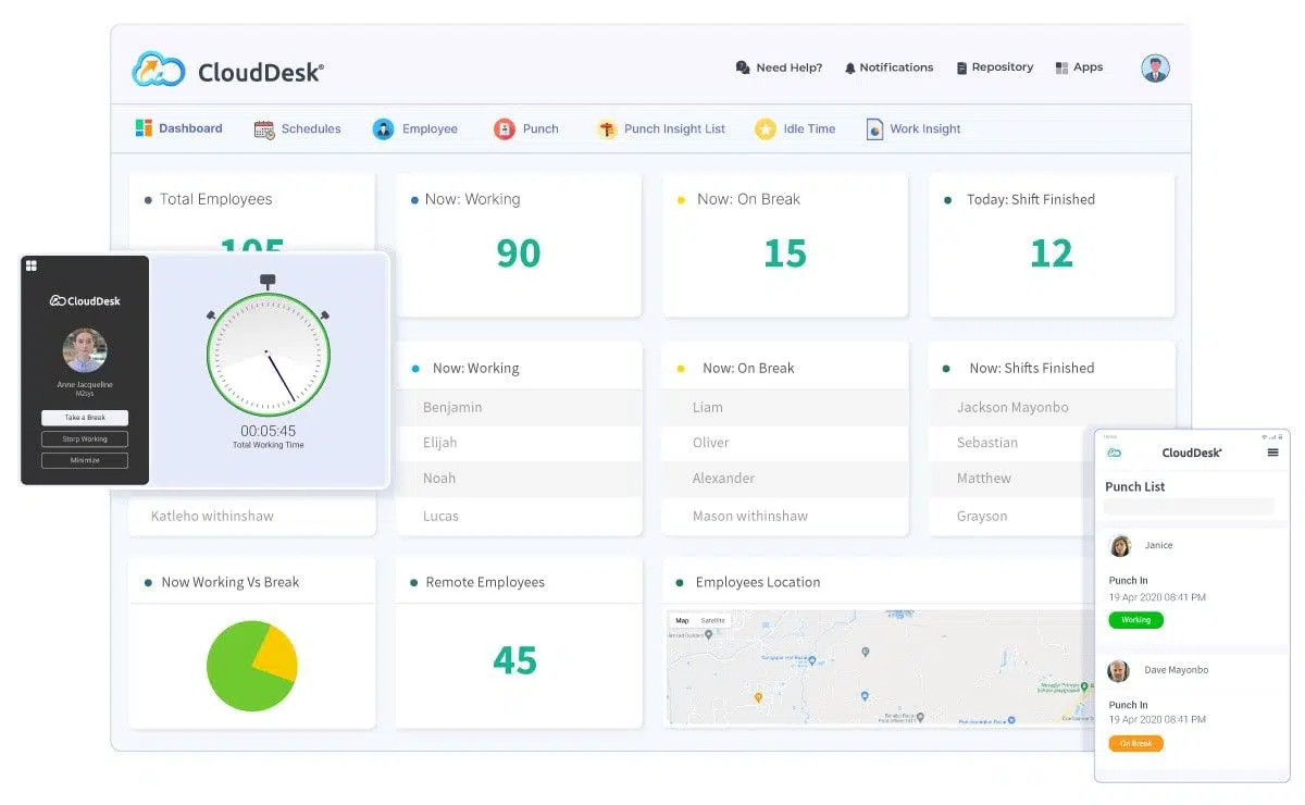 CloudDesk to kompleksowe oprogramowanie do monitorowania pracowników, służące do zarządzania produktywnością zespołu. Posiada wszystkie standardowe funkcje, w tym śledzenie czasu i aktywności, a jego głównym celem jest wspieranie pracowników w wykonywaniu obowiązków. Oprogramowanie jest przyjazne dla użytkownika i stanowi świetne rozwiązanie dla firm, które chcą monitorować pracowników, szanując jednocześnie ich prywatność.
