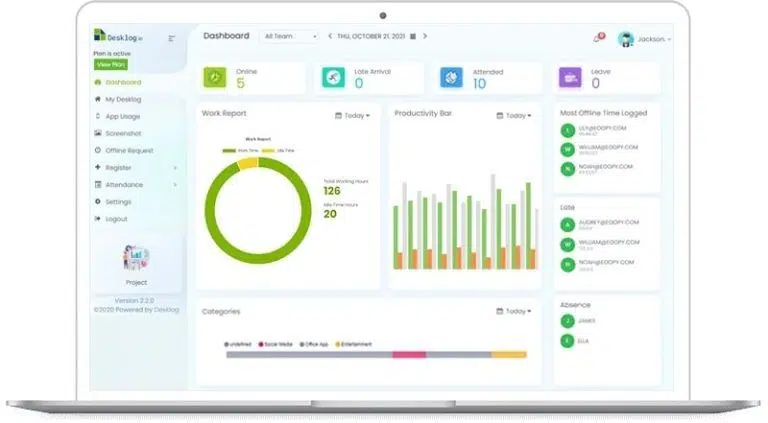 Desklog umożliwia nie tylko monitorowanie pracowników, ale także zarządzanie obecnością. Obsługuje zarówno zespoły zdalne, jak i stacjonarne, dzięki funkcjom automatycznego logowania czasu oraz wykonywania zrzutów ekranu, ułatwiając codzienne zarządzanie zespołem.