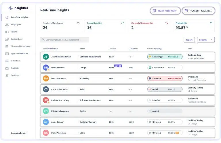 Insightful wykonuje zrzuty ekranu w dowolnym momencie dnia, śledzi użycie aplikacji i stron internetowych oraz rejestruje czas pracy, dając pełny obraz wykorzystania godzin roboczych.
