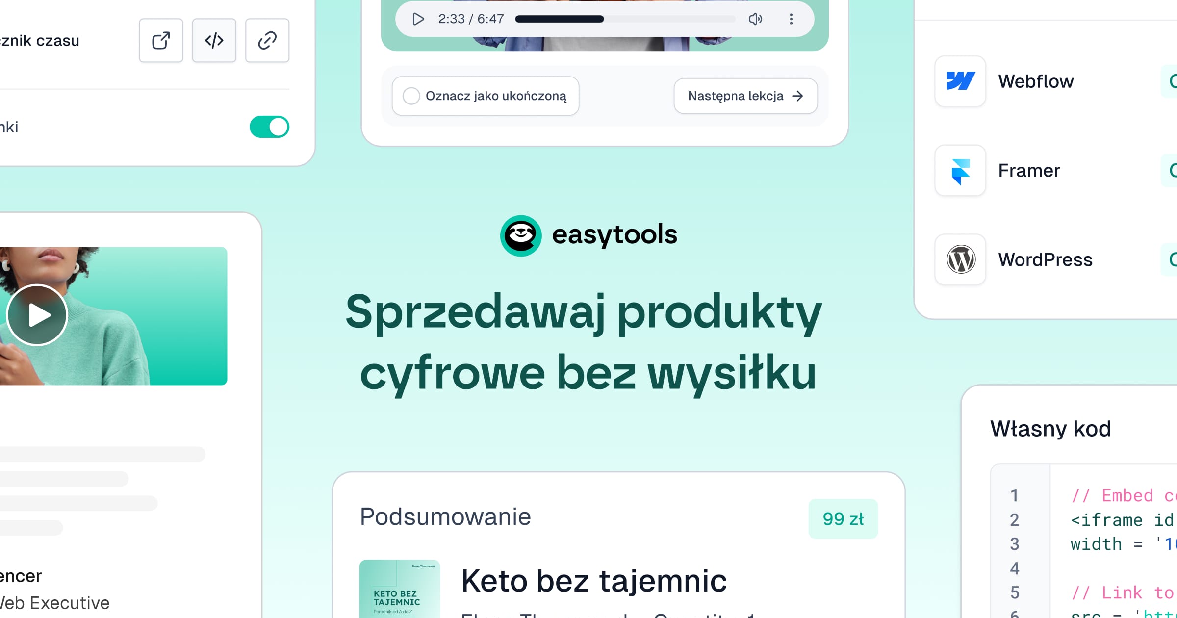 Easytools to polska platforma do sprzedaży online dedykowana twórcom produktów cyfrowych – ebooków, kursów online, konsultacji, usług oraz subskrypcji. Platforma umożliwia szybkie uruchomienie sprzedaży bez konieczności zakładania sklepu internetowego i zawiera wszystkie narzędzia niezbędne do kompleksowej obsługi e-commerce.