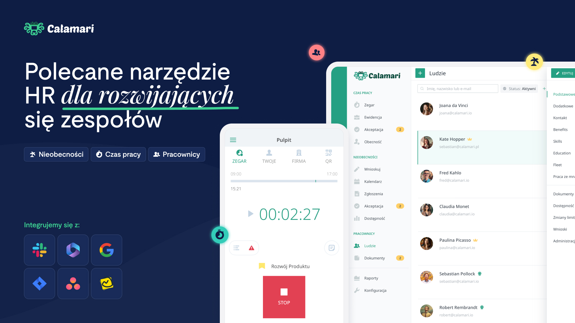 Calamari łączy zarządzanie urlopami, ewidencję czasu pracy i dane kadrowe w jedną platformę, która jest sprawdzona przez zespoły hybrydowe na całym świecie. Najważniejsze procesy HR można zaadresować z poziomu Slack czy MS Teams – bez przełączania się między aplikacjami. Integracje z Google Workspace czy Jirą pomagają zachować skupienie na pracy.