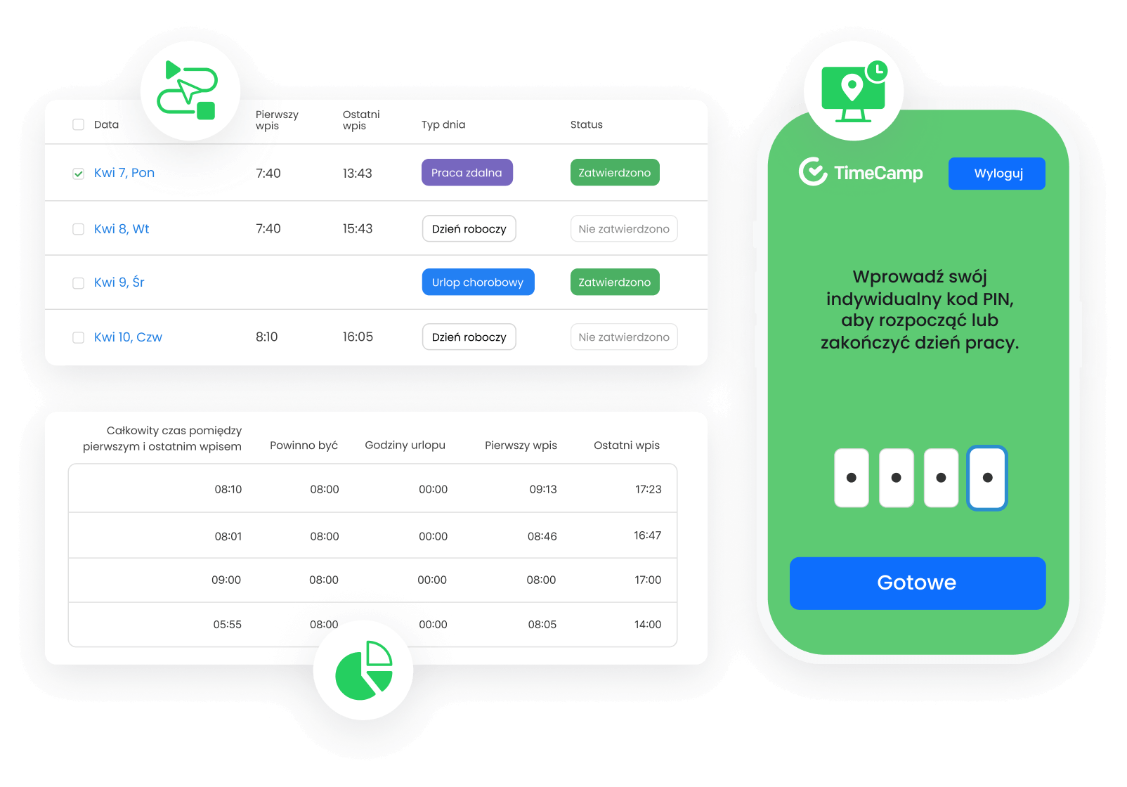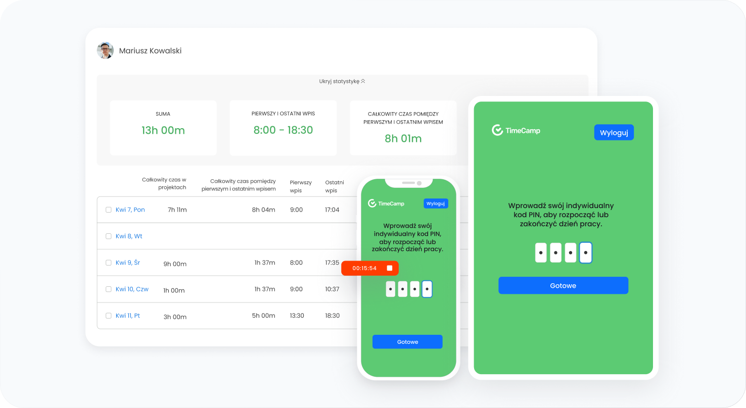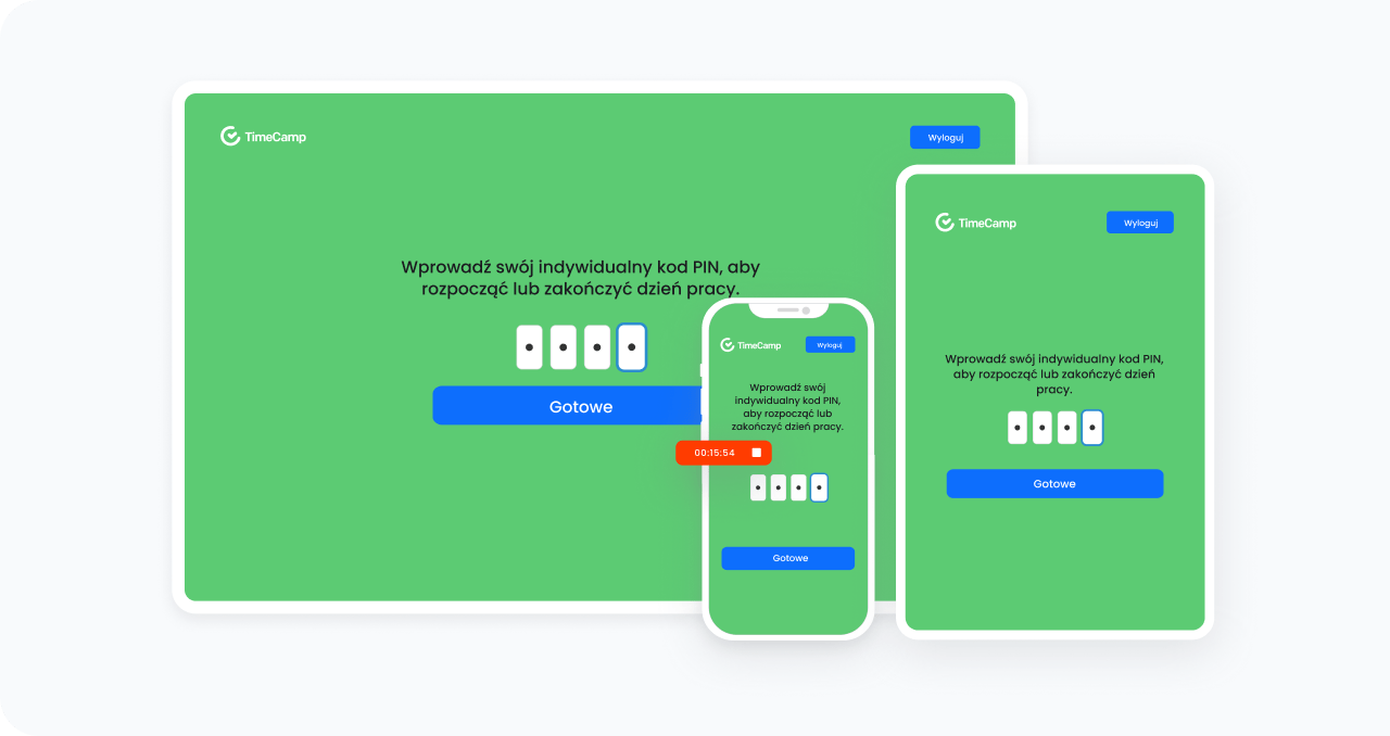 Kiosk został zaprojektowany z myślą o łatwym wykorzystaniu przez każdego pracownika. Wystarczy, że użytkownik wpisze czterocyfrowy kod PIN na dowolnym urządzeniu wybranym przez pracodawcę – np. laptopie, smartfonie lub tablecie z aplikacją TimeCamp.