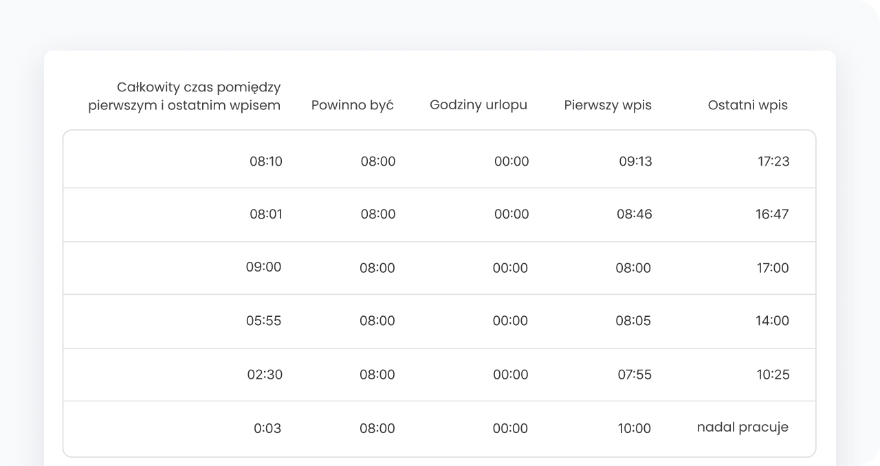 TimeCamp zapisuje dokładny moment rozpoczęcia i zakończenia pracy. Dzięki temu system rejestrowania czasu pracy umożliwia bieżące monitorowanie obecności pracowników, wspierając planowanie zadań oraz ewidencję godzin.