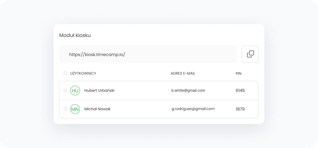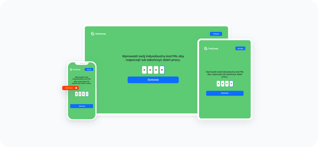 Kiosk został zaprojektowany z myślą o łatwym wykorzystaniu przez każdego pracownika. Wystarczy, że użytkownik wpisze czterocyfrowy kod PIN na dowolnym urządzeniu wybranym przez pracodawcę – np. laptopie, smartfonie lub tablecie z aplikacją TimeCamp.