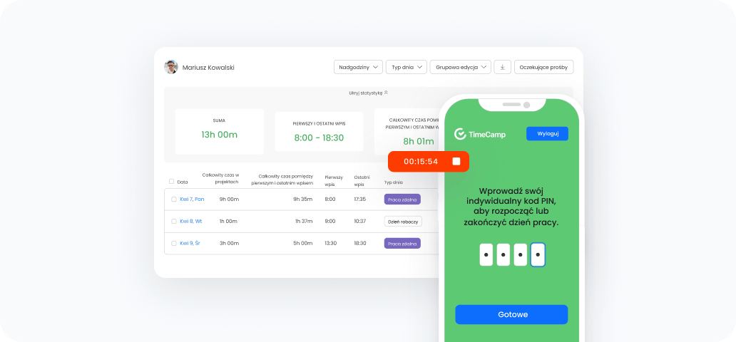 TimeCamp zapisuje dokładny moment rozpoczęcia i zakończenia pracy. Dzięki temu system rejestrowania czasu pracy umożliwia bieżące monitorowanie obecności pracowników, wspierając planowanie zadań oraz ewidencję godzin.