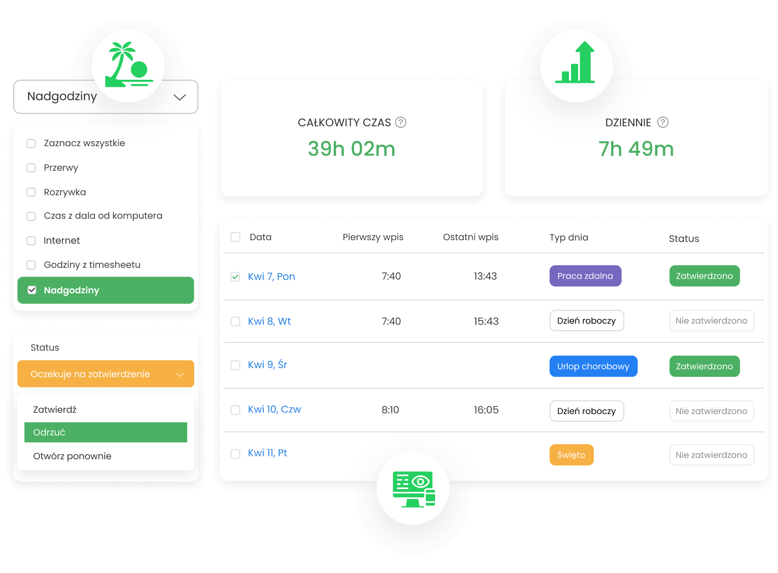 TimeCamp umożliwia rejestrowanie przyjścia i wyjścia każdego pracownika w czasie rzeczywistym, eliminując konieczność prowadzenia dokumentacji w formie papierowej. Dzięki temu uzyskasz dokładny zapis godzin pracy, umożliwiając skuteczne zarządzanie czasem pracy w zakładzie pracy.